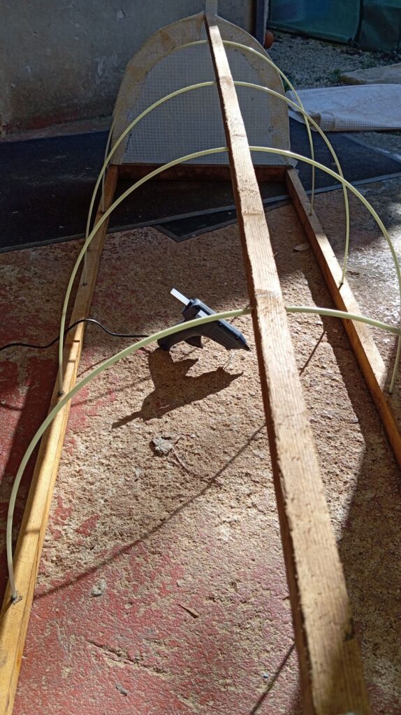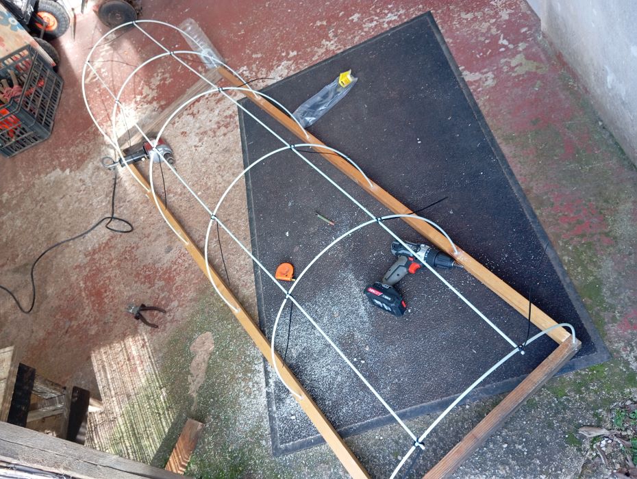 Karbonske žice od odbačenih šatora sam pilom za željezo ispilio: dvije na dužinu od 190cm, a 6kom na dužinu 120cm. Prethodno sam odredio da bi mi odgovaralo da plastenik bude visok približno 40cm. Izračunom sam dobio dužinu žica za lukove od 120cm. Izbušio sam odgovarajuće rupe te umetnuo žice za lukove.