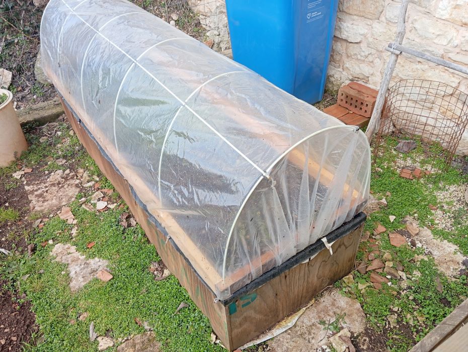 Tako da su dimenzije plastenika oko 190x60cm, kao poslijedica veličine 6 kontejnera za presadnice. Ukratko, napravio sam plastenik određen veličinom visoke gredice. Ljeti u visokoj gredici uzgajam krastavce i tikvice, zimi radić a u proljeće sadnice.